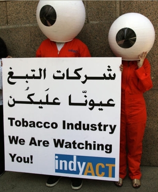 اعتراض فعالان مدافع ممنوعیت سیگار در اماکن عمومی در قابل دفتر مرکزی شرکت دخانیات در لبنان. روی پلاکارد نوشته: صنعت دخانیات ! ما (دوچشمی) شما را می پاییم " اشاره این فعالان به لابی شرکت دخانیات با دولت لبنان برای لغو قانون ممنوعیت استعمال