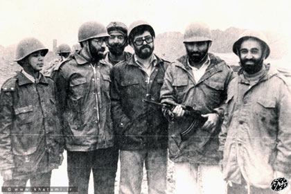سید محمد خاتمی در جبهه کردستان از راست : حجت الاسلام والمسلمین محمد علی صدوقی - محمد امین سازگارنژاد - شهید سید حسن شاهچراغی - حجت الاسلام والمسلمین سید محمد خاتمی