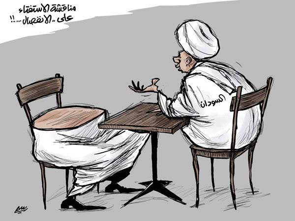 مذاکرات دولت سودان با منطقه جدایی طلب جنوب / قرار است سرنوشت استقلال جنوب سودان در یک همه پرسی تعیین شود. دولت مرکزی در صدد به تعویق انداختن این همه پرسی است. کاریکاتور از الشرق الاوسط