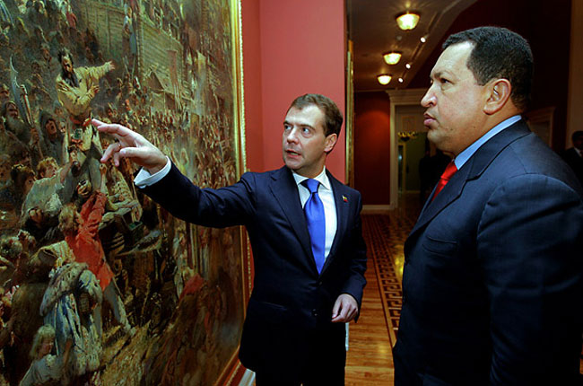 دمیتری مدودف رییس جمهوری روسیه در حال نمایش یک تابلوی نقاشی به  همتای ونزوئلایی اش در اقامتگاه ریاست جمهوری روسیه در حومه مسکو