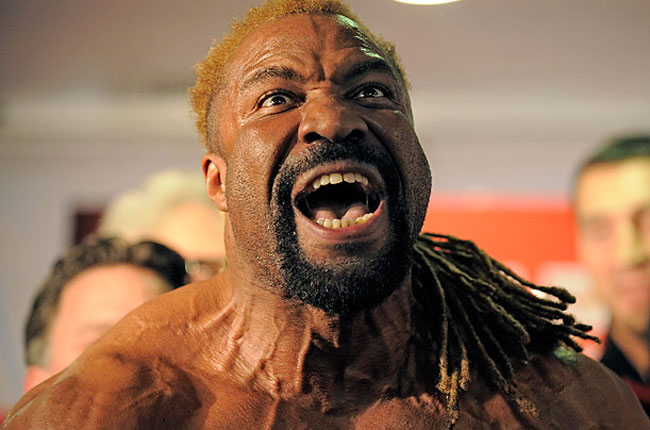 صحنه  نعره کشیدن شانون بریگز قهرمان بوکس سنگین وزن آمریکا در حال وزن کشی برای انجام مسابقه با یک بوکسور اوکراینی