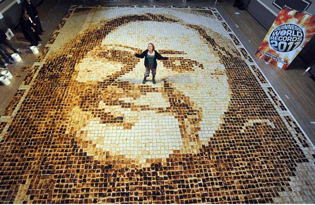 یک هنرمند بریتانیایی با استفاده از 9852 تکه " نان تست " تابلوی مادر خوانده خود را ترسیم کرده است. این تصویر بزرگترین تابلوی نان تست در جهان است