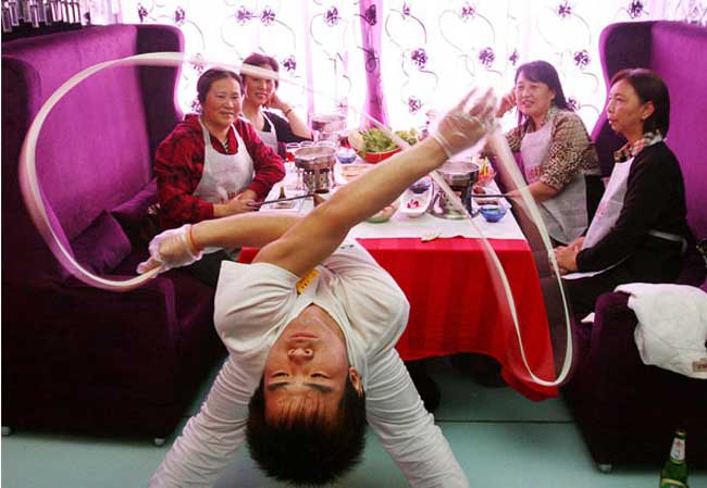 رقص نودل ( رشته ) یکی از آشپزهای چینی در یک رستوران برای مشتری ها