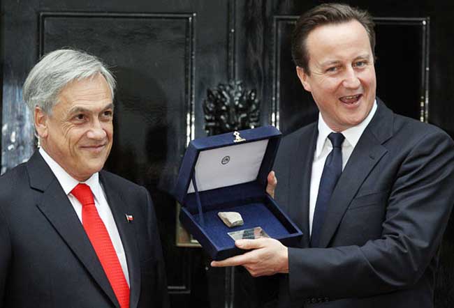سباستین پینرا رییس جمهوری شیلی در سفر اخیر خود به بریتانیا در مقر نخست وزیری انگلیس در لندن یک تکه سنگ از معدن معروف شیلی به دیوید کامرون نخست وزیر بریتانیا اهدا می کند