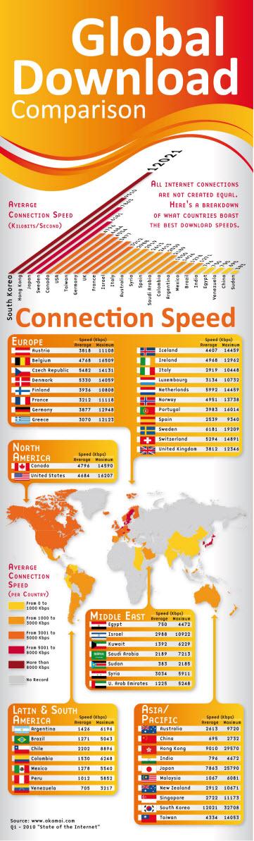هفته ی گذشته گرافیک اطلاعاتی بسیار زیبا به نقل از Akamai منتشر شد که سرعت دانلود در مناطق مختلف دنیا را نشان می داد.همانطور که مشاهده می کنید، پر سرعت ترین اینترنت به ترتیب از آن کاربران کشورهای