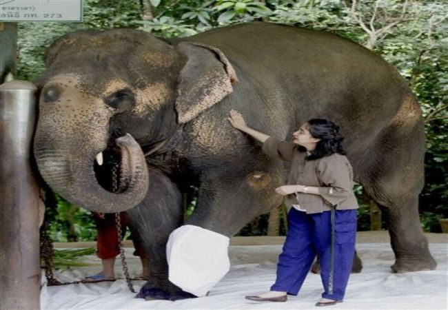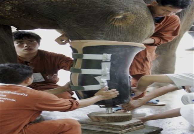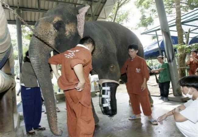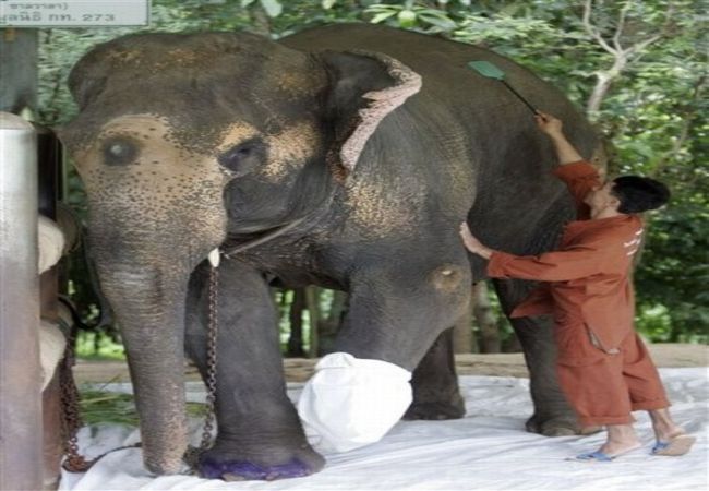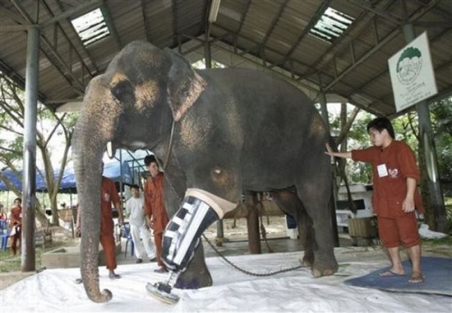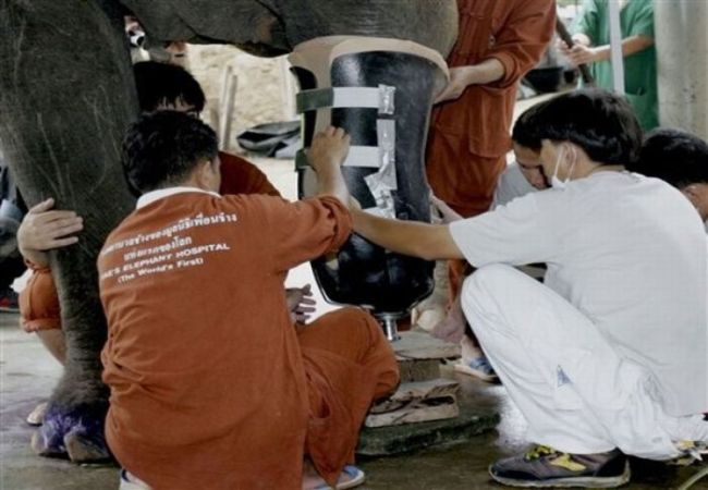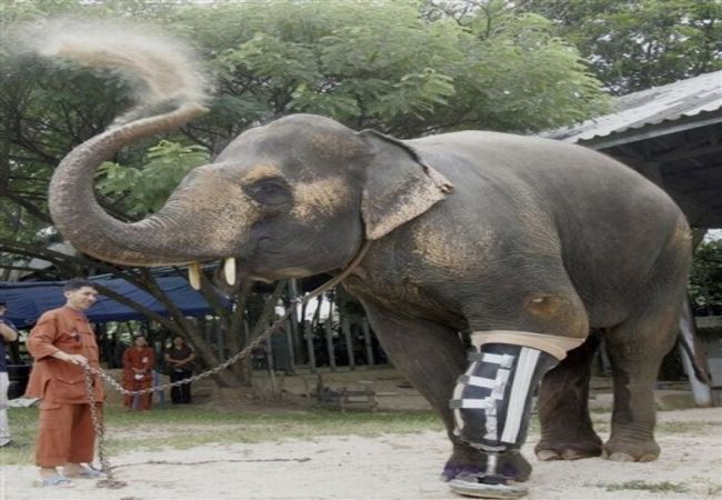 موتولا فیل ماده 48 ساله تایلندی ده سال پیش پای چپش را در اثر رفتن روی مین از دست داد. اکنون دامپزشکان بیمارستان فیل ها یک پای مصنوعی برای موتولا تهیه کرده اند.