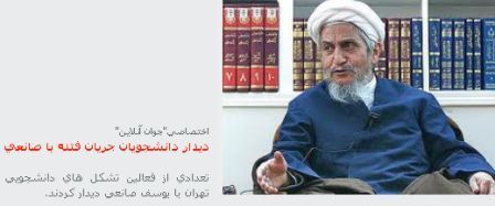 سایت روزنامه اصولگرای جوان خبر زیر را درباره دیدار عده ای از دانشجویان با آیت الله صانعی منتشر کرده است که عیناً می آید:اخيراً تعدادي از فعالين تشکل هاي دانشجويي حامي جريان فتنه دانشگاههاي تهران در سفر به شهرستان قم با مراجعه به دفتر آقاي يوسف صانعي با وي ديدار که نامبرده پيرامون ضرورت آزادي بيان و فوايد آن براي جامعه و نحوه چگونگي غيبت از ظالم و ظالمين سخنراني نموده است.