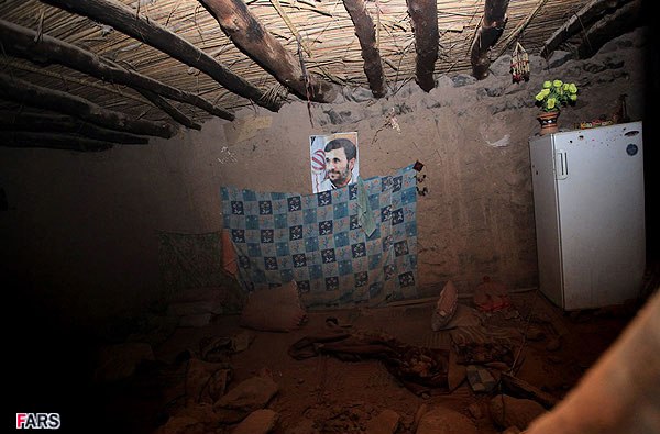 دیوار آن در اثر زلزله فرو ریخته و یک دیوار که عکس دکتر احمدی نژاد بر آن