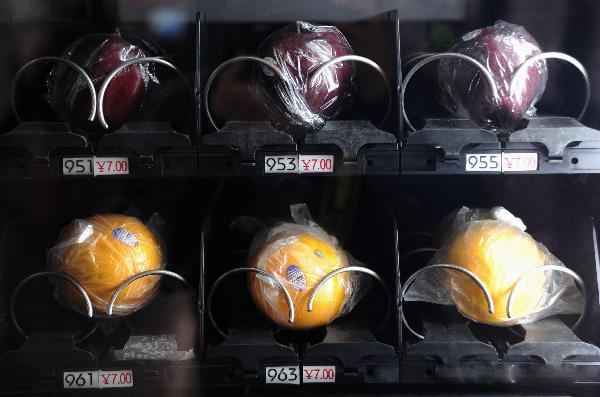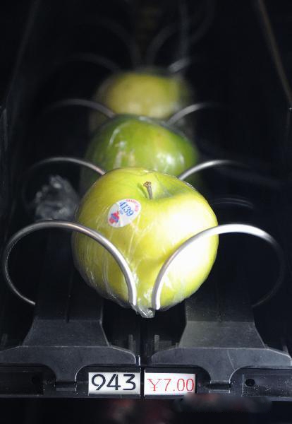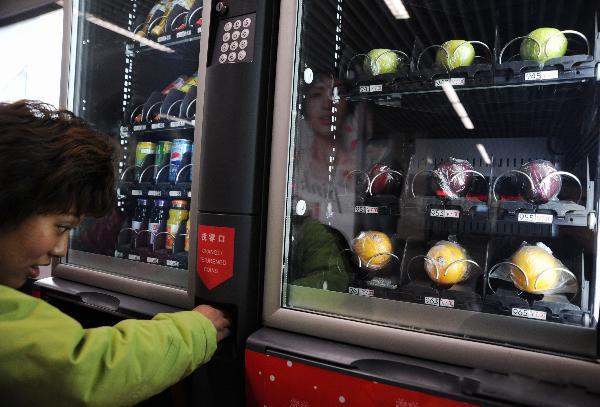 دستگاههای میوه پرداز طوری طراحی شده اند که در قفسه های مختلف قرار گرفته و جلوی هر نوع میوه قیمت و کد مورد نظر نوشته شده است و کافی است شما مثلا 7 یوآن پرداخت کرده تا پرتغال خود را دریافت کنید.