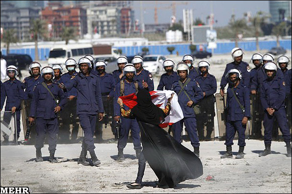 زن بحرینی در برابر پلیس / در روزهای اخیر دهها بحرینی معترض بر اثر شلیک مستقیم گلوله نیروهای ارتش و پلیس کشته و زخمی شدند.