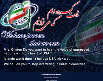 عصر ايران مراجعه كنندگان به وب سايت فارسي صداي آمريكا با صفحه اي مواجه مي شوند كه روي آن پيامي خطاب به خانم هيلاري كلينتون وزير امور خارجه آمريكا با شعار : ثابت كرده ايم كه مي توانيم " نوشته شده است.