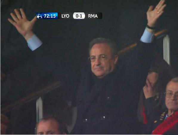 وقتی که کریم بنزما تنها یک دقیقه پس از ورودش به زمین مسابقه گل ارزشمندی را برای رئال به ثمر رساند و تیم مادریدی را از حریفش پیش انداخت، فلورنتینو پرس، رئیس باشگاه مادریدی این چنین شادی اش را ابراز کرد؛ هرچند که این شادی خیلی طول نکشید و گومیس، بازیکن تیم حریف با به ثمر رساندن گلی در دقایق پایانی بازی، نتیجه را مساوی کرد.