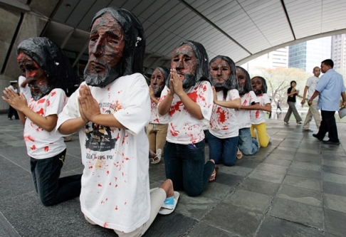 تجمع معترضان به وضعیت فقر در فیلیپین در بیرون محوطه بازار بورس این کشور با ماسک های حضرت مسیح (ع) برای نشان دادن اهمیت توجه به فقرا