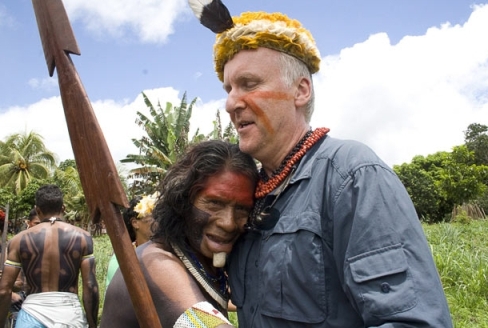 جیمز کامرون کارگردان مشهور هالیوودی در منطقه آمازون برزیل و در حال خوش و بش با یکی از بومیان برزیلی
