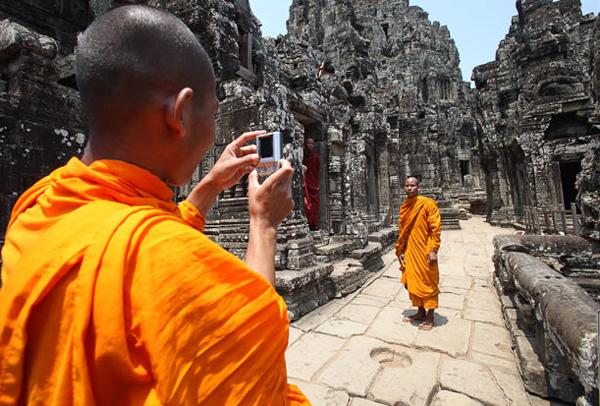عکس گرفتن راهبان بودایی در معبدی در کامبوج