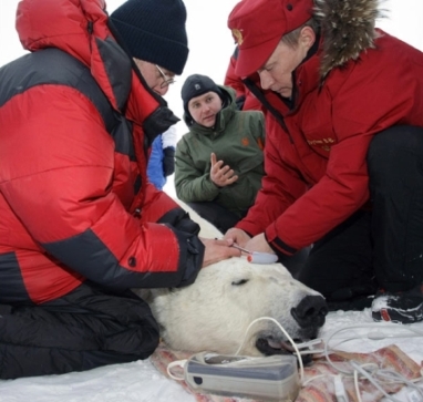 ولادیمیر پوتین نخست وزیر روسیه در حال اندازه گیری قد یک خرس قطبی بيهوش در مجاورت اقیانوس منجمد شمالی