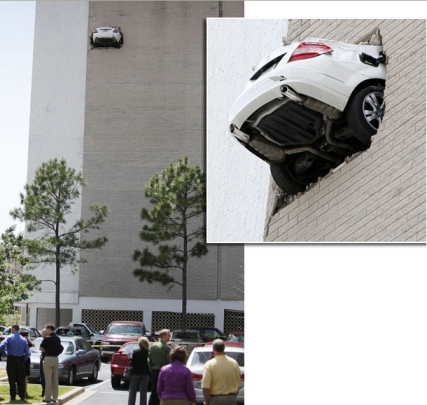 بیرون زدن یک اتومبیل از دیوار طبقه هفتم پارکینگ ساختمان بانک آمریکا در اوکلاهمای آمریکا
