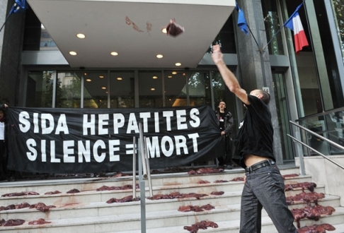 ریختن جگر حیوانات در مقابل در ورودی ساختمان وزارت بهداشت فرانسه در پاریس به نشانه اعتراض به سیاست های بهداشتی دولت فرانسه در کم توجهی به بیمارهای مبتلا به  ایدز و هپاتیت