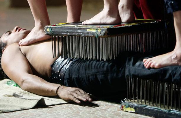 راغب کبرا مرد 22 ساله مصری در شهر بندری شرم الشیخ برای کسب درآمد این چنین زیر و روی لوح های میخ کوب قرار می گیرد و از توریست ها می خواهد به روی آن بروند و در عوض به او پول بدهند