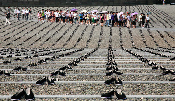 چیدن هزاران قطعه کفش چینی  در مقابل معبد یادبود قربانیان قتل عام نانجینگ در مراسم  سالگرد این  قتل عام . درقتل عام نانجینگ که در سال 1937  روی داد هزاران کارگر چینی به دست نیروهای ژاپنی قتل عام شدند