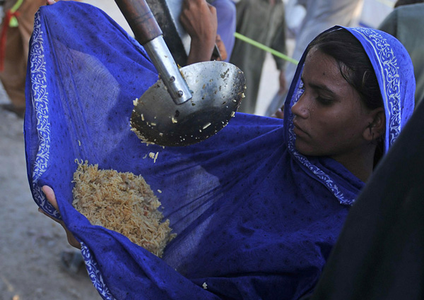 یک زن سیلزده پاکستانی در حال دریافت غذا