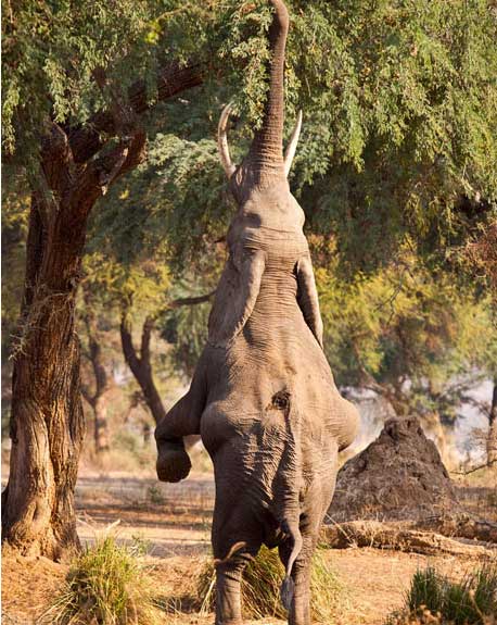 تلاش یک فیل برای خوردن برگ های یک درخت در پارک ملی زامبیا