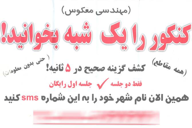 زمانی که من واسه کنکور ارشد میخوندم دوستم یه چیزی شبیه این به من نشون داد و خیلی هم ازش تعریف کرد من توجهی نکردم ولی اون کرد. بعدش من تک رقمی شدم و اون مجاز نشد! دو سال بعدعین این آگهی رو تو خیابون ولیعصر دیدم و ازش یه عکس گرفتم البته خیلی هم متاثر شدم.