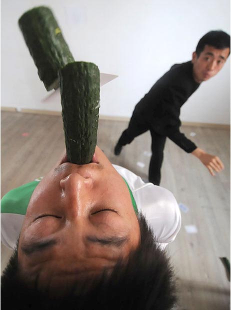 هنرنمايي يك جوان 23 ساله چيني در بريدن خيار با پرتاب كارت بازي از راه دور