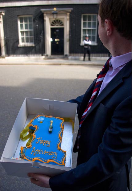 يك گزارشگر تلويزيون در بريتانيا كيك نخستين سالگرد تشكيل دولت ائتلافي بريتانيا را در مقابل مقر نخست وزيري در دست گرفته است