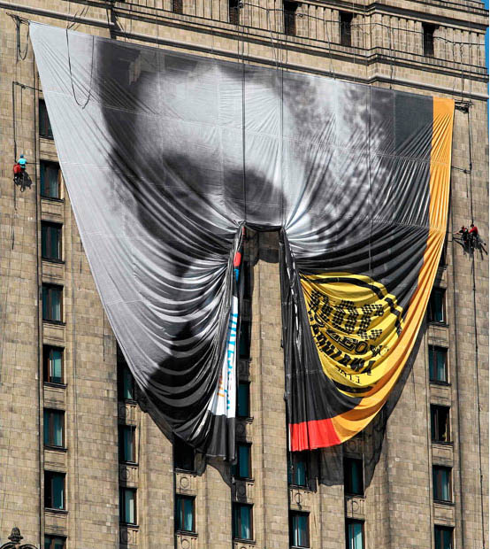 نصب بنر بزرگ ازتصوير "ماري كوري " دانشمند زاده لهستان و برنده دو جايزه نوبل فيزيك (1903) و شيمي(1911) به خاطر تحقيقاتش روي راديو اكتيو ، بر روي ساختمان قصر فرهنگ در ورشو