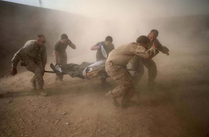 انتقال يكي از مجروحان ارتش آمريكا به هلي كوپتر در منطقه سنگين در هلمند افغانستان