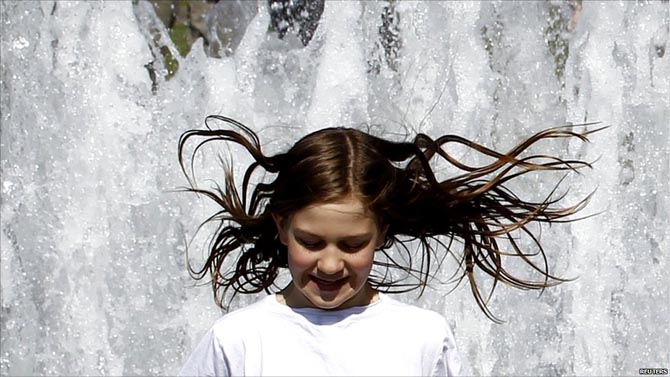 بازي دختر بچه آلماني در كنار يك فواره آب در شهر برلين
