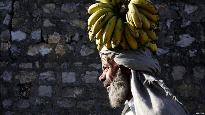 يك مرد در ابت آباد پاكستان در حال حمل خوشه موز بر روي سرش