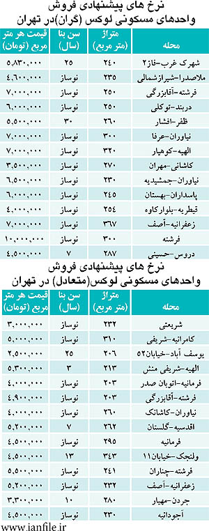 شواهد در سایت ایران فایل، گفته رییس کانون انبوهسازان را (نیمی از متقاضیان در بازار مسکن به دنبال واحدهای لوکس هستند) تایید میکند، زیرا در قسمت فایلهای پربیننده یا آخرین جستوجوها، متقاضیان به دنبال چنین واحدهایی هستند، اما نکته قابل توجه دراین مورد این موضوع است که مراجعهکنندگان در جستوجوی واحدهای پیش فروش لوکس یا همان متراژ بزرگ هستند. برای مثال در منطقه کامرانیه، خیابان تاجیک واحدی با متراژ 285 متر مربع با تمامی امکانات در مرحله نازک کاری به بازار پیش فروش عرضه شده است و زمان تحویل این واحد 12 ماه بعد است و قیمت هر متر مربع آن 7 میلیون تومان اعلام شده است در حالی که نرخ هر متر مربع واحد مسکونی پیش فروش در کامرانیه بین 4 میلیون تا 5 میلیون و 280 هزار تومان برآورد میشود.