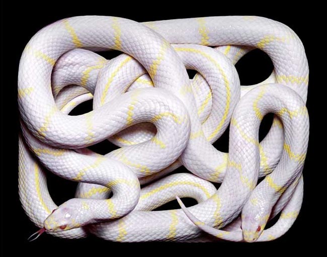 این‌ مارها به مارهای پادشاه کالیفرنیا معروفند. اغلب آن‌ها سیاه و سفید هستند،‌ اما مارهایی که در این تصویر می‌بینید، ‌زال هستند و رنگدانه در بدن خود ندارند. رنگ‌هایی که می‌بینید رنگ واقعی این مارها است و هیچ ویرایش تصویری روی رنگ مارها انجام نشده است.