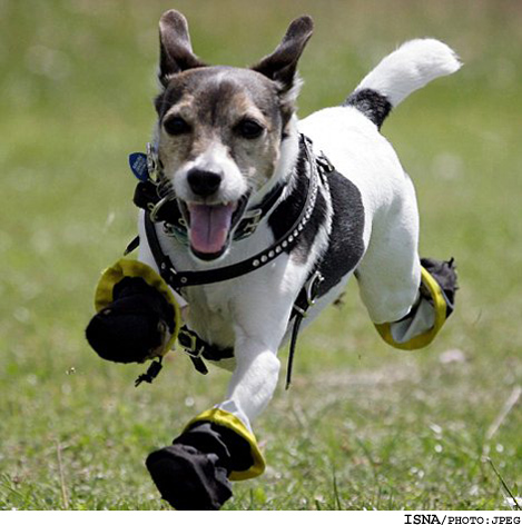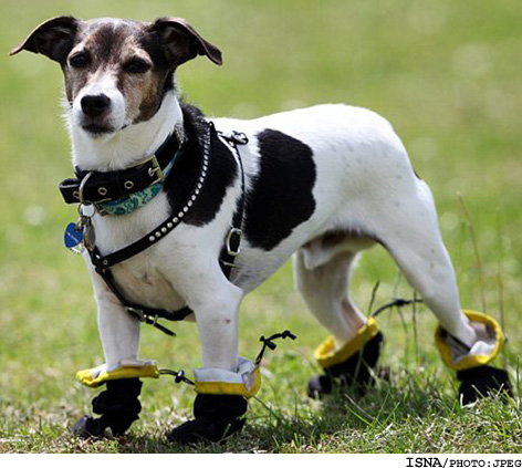 ایسنا: صاحب يك سگ اعلام كرد كه اين حيوان به دليل حساسيت شديد به چمن از كفشهاي مخصوص استفاده ميكند.
