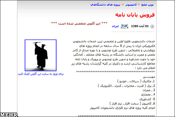 نمونه ای از تبلیغات یک سایت برای فروش پایان نامه
