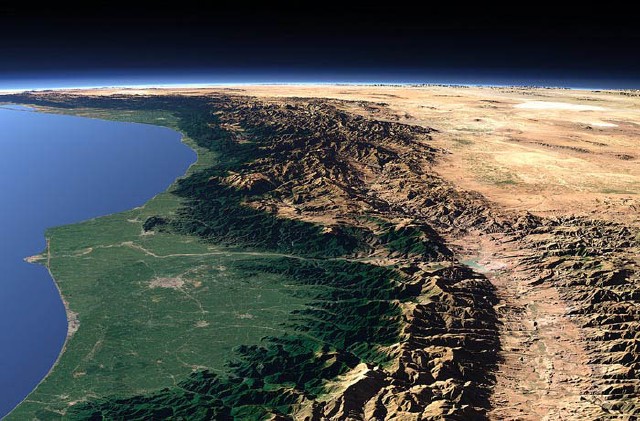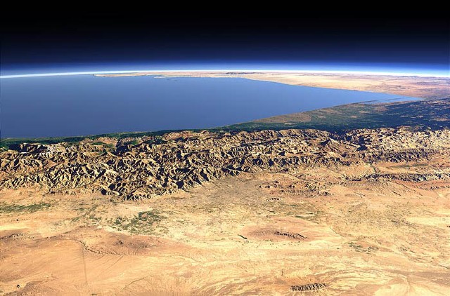 در این تصویر کوه زاگرس را می بینید که تا چند صد کیلومتر از خلیج فارس گسترش یافته است. شهر شیراز و ویرانه های باستانی تخت جمشید در سمت راست در کنار دریاچه نمک مهارلو واقع شده است.