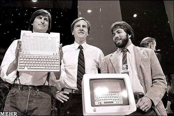 1984- همراه با جان شولی و استیو وزنیاک در رونمایی از رایانه Apple II c