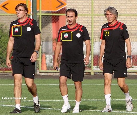 همانطور که در تصویر مشاهده می کنید تنها این مربی است که لباسش پرچم ایران را ندارد و مشخص نیست مسئولان باشگاه چنین لباس خاصی را در اختیار او قرار داده اند (که بعید است) و یا خود او پرچم ایران را از لباسش جدا کرده است !