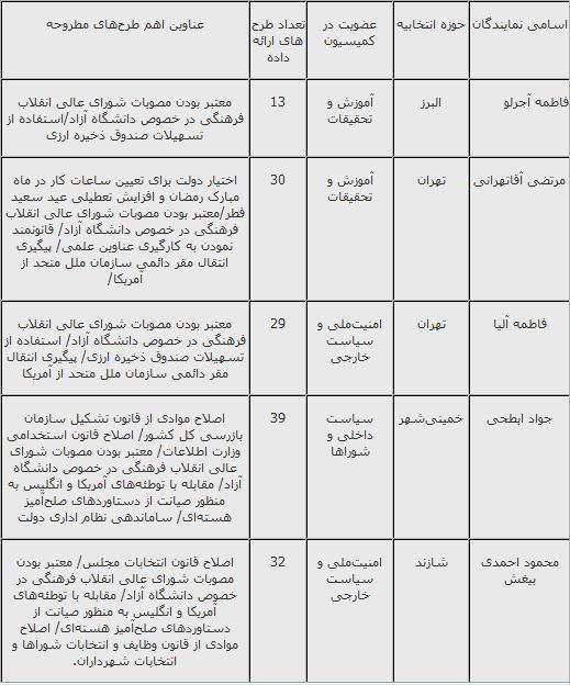 آنچه در پی می آید جدولی از حضور فعالیتهای تقنینی نمایندگان شاخص عضو فراکسیون انقلاب اسلامی است: