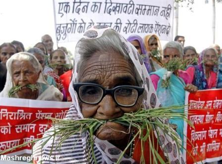 خوردن علف توسط بازماندگان فاجعه بوپال در تظاهراتی به منظور افزایش حقوق بازنشستگان در هند. نشت گاز در کارخانه اتحادیه کاربید در بوپال در سال 1984 هزاران نفر از مردم را در یکی از بدترین حوادث صنعتی جهان به قتل رساند./مشرق