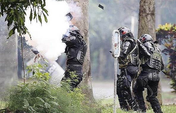 مجروح شدن يك پليس ضد شورش كلمبيا توسط يك بمب دست ساز نه چندان قوي در تظاهرات دانشجويي در شهر كالي.