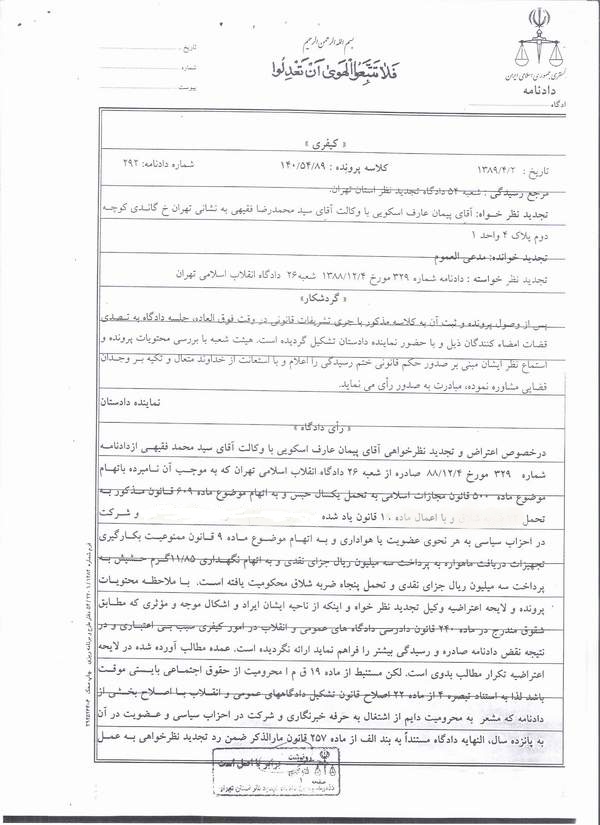 این در حالی است که طبق اخبار واصله خبرنگار ما، حکم دادگاه کیفری و تجدید نظر پیمان عارف اسکویی با وکالت آقای سید محمد فقیهی، به صراحت نشان می دهد که وی به اتهام نگهداری 11.85 گرم یعنی 11 و 85 صدم گرم حشیش به پرداخت 3 میلیون ریال جزای نقدی و تحمل 50 ضربه شلاق محکوم شده است.