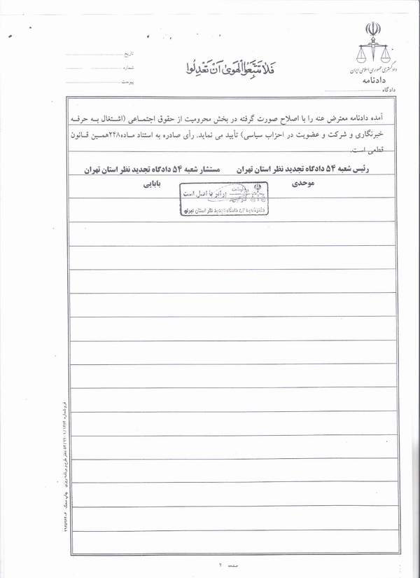 همچنین در بند دیگری از حکم آمده است که وي به اتهام موضوع ماده 9 قانون ممنوعیت به کارگیری تجهیزات دریافت ماهواره اي به پرداخت 3 میلیون ریال جزای نقدی محکوم شده است.