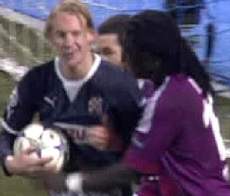 ویدا، بازیکن دینامو زاگرب، به نشانه تائید گل پنجم لیون، دستش را بالا برد وبعد از آن رو به گومیس، برترین گلزن لیون در این بازی چشمک می زند.