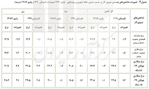 در همین گزارش نرخ بیکاری در گروه سنی جوانان در مقایسه با پاییز سال 89 در حدود 2 درصد کاهش پیدا کرده و روند رو به بهبودی را نشان می دهد. قابل ذکر آنکه نرخ مشارکت نیز در دوره مورد بررسی به حدود 35.7 درصد رسیده است که در مقایسه با پاییز سال 89 حدود 2.2 درصد کاهش را نشان می دهد.