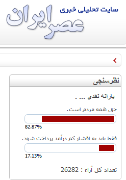 ممنون از اين نظرسنجي اما يك نكته اي در اينگونه نظر سنجي ها مغفول مانده و آن اينكه معمولا كساني كه به اينترنت دسترسي دارند و از سايت شما بازديد مي كنند و در اكثر نظرسنجي هايي كه بنده نظرات كاربران شما را خوانده ام، عمدتا قشر شهري مي باشند كه به اينترنت دسترسي دارند و معمولا قشر ضعيف جامعه كه عمدتا در حومه شهرها يا روستاها ساكن هستند به اندازه ساكنان شهرها كه از لحاظ درآمدي اغلب بالاتر از قشر ضعيف روستايي مي باشند، به اينترنت دسترسي ندارند لذا نتيجه اين نظرسنجي غلط مي باشد چرا كه منطقي نيست شما در بين عده اي تقريبا مشابه هم نظر سنجي برگزار كنيد و انتظار نتيجه اي داشته باشيد كه در راستاي احقاق حق و عدالت براي افرادي باشد كه به دلايل گوناگون كمتر در گروه آماري نقش و حضور دارند