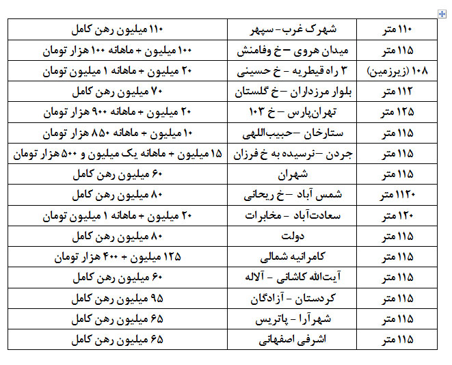 فرارو: لیستی از آپارتمانهای 100 تا 125 متر در مناطق مختلف تهران که امروز (23 فروردین 1391) برای رهن کامل یا رهن و اجاره پیشنهاد شدهاند: