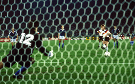 عصر ایران ورزشی - در عکس زیر، ضربه پنالتی مشهور آندریاس برمه را در فینال جام جهانی 1990 مشاهده می کنید. تیم ملی آرژانتین در آن بازی تاریخی، در غیاب کانی گیا، توان چندانی برای حمله کردن نداشت اما جانانه دفاع می کرد تا در ضربات پنالتی، جام را از آلمان بگیرد. ولی در دقیقه 86 بازی، داور یک پنالتی مشکوک برای آلمان گرفت. سرجیو گویکوچه آ، دروازه بان تیم ملی آرژانتین، تا پیش از بازی فینال، چهار پنالتی از یوگوسلاوها و ایتالیایی ها گرفته بود و تیمش را به فینال رسانده بود. همین باعث شد که لوتار ماتیوس، کاپیتان تیم ملی آلمان، از زدن ضربه پنالتی ابا کند و مسئولیت گل کردن آن ضربه را به آندریاس برمه واگذار کند. ضربه دقیق برمه، با فاصله میلی متری از زیر دست گویکوچه آ وارد دروازه تیم ملی آرژانتین شد تا آلمان برای سومین بار قهرمان جام جهانی شود.